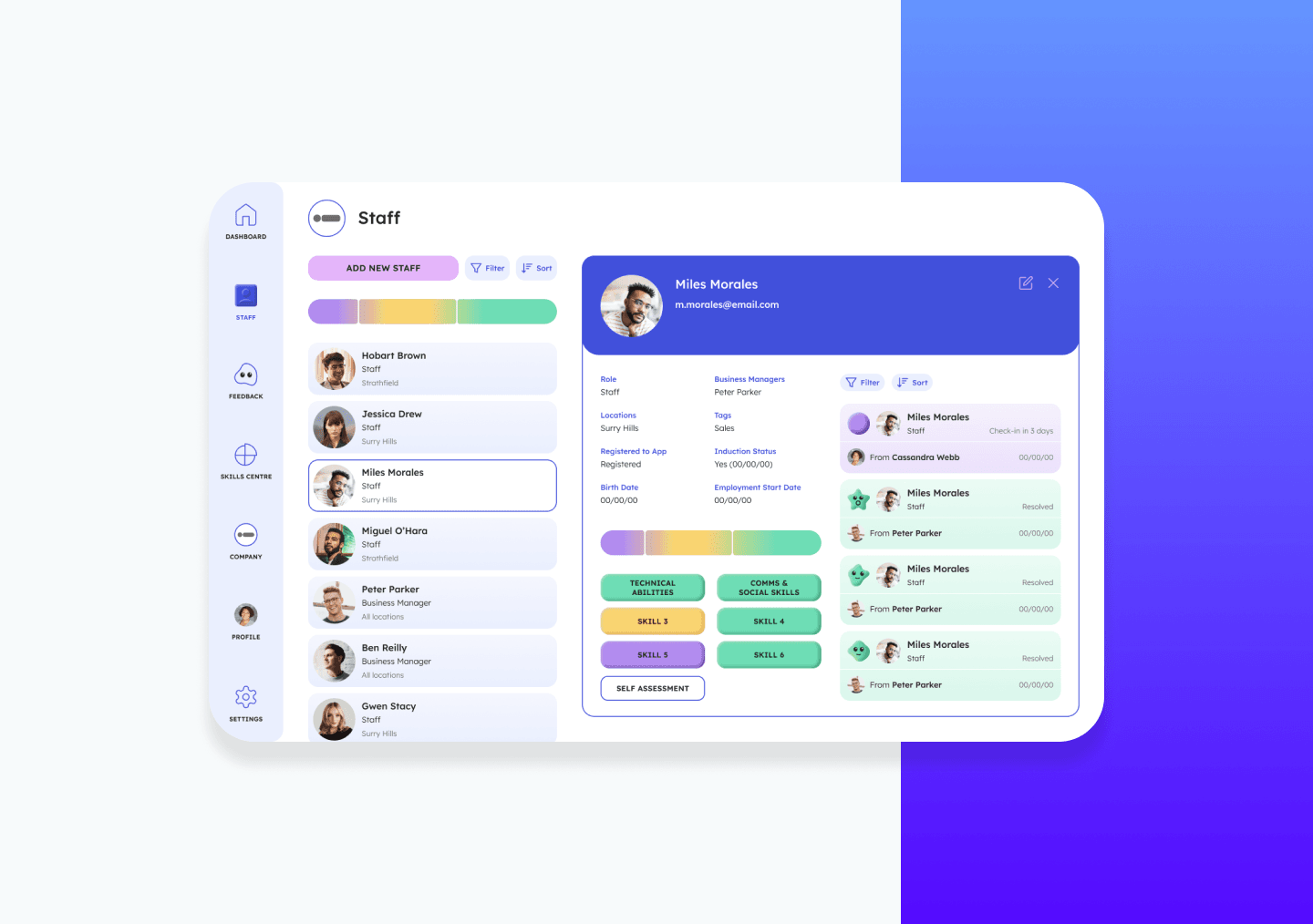 The app incorporates three levels of users: business owners, business managers, and staff members. Owners of the company can manage all users within their company, managers may be associated with one or more of the company’s locations, and essentially act as an authorised manager of specific staff members, and staff members can only receive feedback and interact with their authorised managers and business Owners within the limits of their permissions, ensuring a smooth and controlled flow of information.